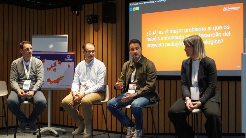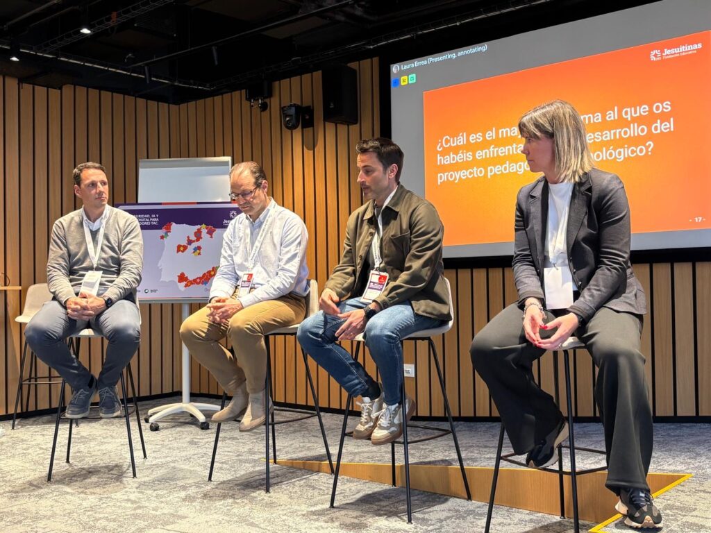 La jornada incluyó una mesa redonda en la que algunos de los responsables TAC de nuestros centros compartieron su visión a la hora de implantar y desplegar proyectos tecnológicos. Desde su experiencia a la hora de utilizar diferentes herramientas y plataformas tecnológicas. Alberto López (Vigo), Víctor Arenzana (Valladolid) y José Antón (Elche), moderados por Laura Errea, abordaron cuestiones relacionadas con el pasado, el presente y el futuro del uso de la tecnología en los centros educativos de Jesuitinas.